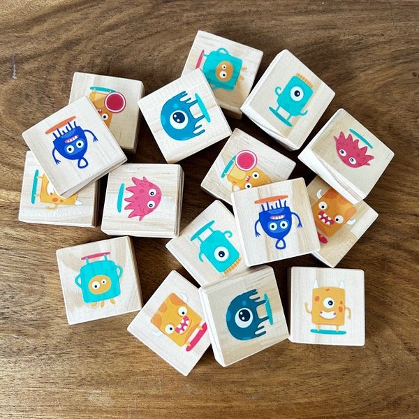 Cada set incluye 16 fichas (8 pares) con ilustraciones originales: robots y otras figuras con caritas simpáticas que encantan a grandes y chicos.