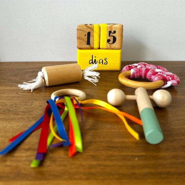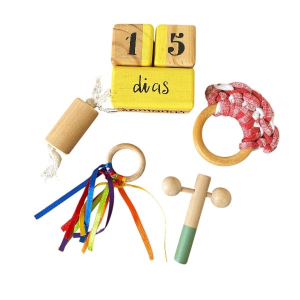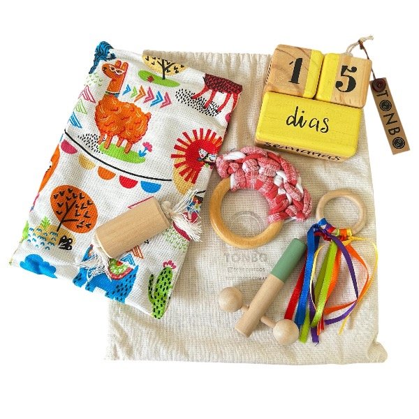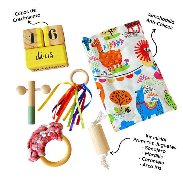Suma un kit inicial de primeros juguetes de madera (sonajero, mordillo, caramelo y arco iris), pensado para estimular los sentidos a partir de los 6 meses, y una almohadilla de semillas multiuso, perfecta para usar en frío en caso de fiebre o en calor para aliviar cólicos.